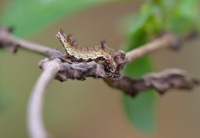 On Wednesday it was very windy with heavy showers predicted. We decided to travel to the Kent border where Nigel had found a tiny White Admiral larva feeding on Honeysuckle in his woodland. It was not much more than 1cm. long but extremely difficult to photograph in the dark wood with the breeze still blowing!!